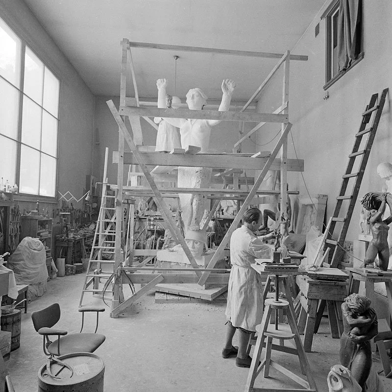 Ateljén byggdes till 1920 av konstnären Ivar Johnsson, som är upphovsman till flera kända installationer i Stockholm och övriga landet.